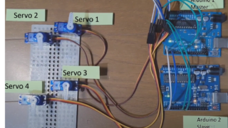 こちらの記事でサーボモータをゆっくり動かすライブラリ(VarSpeedServo.h)と多数のサーボモータを動かすPCA9685の併用が難しいことが分かったので,今回は2台のArduinoを使って,それぞれ2脚ずつ(サーボモータ6個ずつ)接...