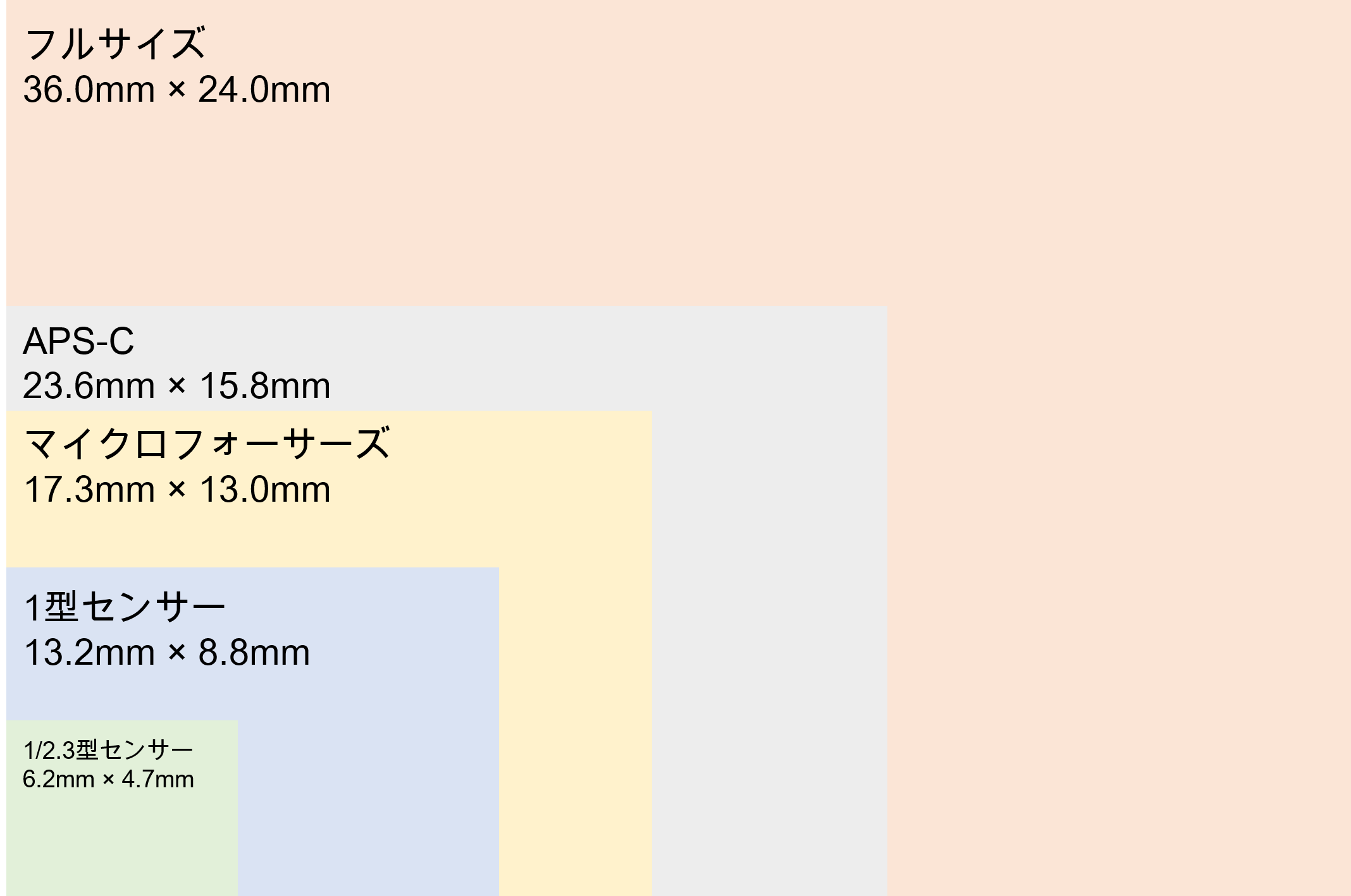 • センサーサイズ;文字通り光を取り込むセンサーの大きさです。これが最重要のスペックであり,ボディの価格に直結します。センサーサイズが大きいと,高感度に耐えられる(暗いところでも撮影できる),ボケを大きくし被写体を際立たせられる(もちろんボケない写真も撮れます),といった大きいメリットがあります。望遠の撮影ではセンサーサイズが小さい方が望遠で撮れるので有利といった説明が頻繁に見られますがその説明は誤りです。これは,同じ焦点距離のレンズをセンサーサイズが大きいボディと小さいボディに装着したとき,後者の方が望遠になる(換算焦点距離が大きくなる)ことから生じる誤解です。前者で撮った写真をトリミングすると後者で撮った写真と同じになります。センサーサイズが小さい方が良いのは画像ファイルサイズが小さくなること価格が安いことくらいです。